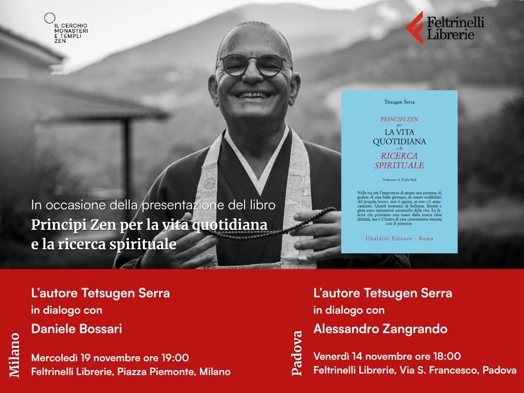 Scopri i nostri eventi Iscriviti Ora Scopri i nostri eventi Vai al calendario eventi Primi Passi nello Zen Inizia a Praticare! Il Cerchio. Monasteri e Centri Zen Scopri i luoghi della Pratica Buddhista Zen in Italia Milano Centro Zen Milano L20 Berceto SanboJi – Tempio dei Tre Gioielli. Cecina GyoSho – Camminando nella Vita Napoli Tempio Zen Ten Shin – Cuore di Cielo Puro Padova Tempio Zen Sokuzen – Orazen Pesaro Tempio Unsui – Nuvole e Acqua Metaverso Zen Metaverse – Il Monastero Virtuale di Ensoji Zen Village: dove essere umani. Scopri il luogo dove la tradizione Zen incontra i bisogni della nostra contemporaneità. Il Maestro Carlo Tetsugen Serra. Dove Meditare in Italia Studiare la Via del Buddha, è studiare sé stessi. Studiare sé stessi è dimenticare sé stessi. Dimenticare sé stessi vuol dire diventare parte del mondo. Eihei Dogen Scopri di più sul nostro lignaggio Pianta il Seme della Consapevolezza. DONA IL TUO 5X1000 Iscriviti e Potrai Meditare in tutte le nostre sedi, Accedere ai corsi e alle meditazioni di Dharma Academy gratuitamente, Sostenere concretamente i Centri e i Monasteri. Dona ora Sostieni l’impegno dei monaci buddhisti zen. Azioni concrete per aiutare tutti gli esseri senzienti. Scopri i progetti attivi! Partecipa ai nostri Eventi Calendario eventi Dal 5 Dicembre ore 14.00 all’8 Dicembre ore 16:00 Berceto O’Sesshin per l’Illuminazione del Buddha Dal 5 Dicembre ore 14.00 al 8 Dicembre ore 16:00 | Aperto a tutti Dal 5 all’8 Dicembre, il Sangha “La Foresta di Bambù” si riunirà al monastero …… Sabato 20 Dicembre 2025 dalle 15.30 Milano Festa d’Inverno Zen a Milano FESTA D’INVERNO ZEN Un’occasione per conoscere in maniera divertente e informale il nostro Centro Zen metropolitano L20 di Milano. Aperta …… Calendario eventi Calendario Scopri le ultime news Tutte le news lunedì 1 Dicembre Due incontri con il Maestro Tetsugen Serra per la presentazione del nuovo libro “Principi Zen per la vita quotidiana e la ricerca spirituale” nelle librerie Feltrinelli. Siamo lieti di annunciare due appuntamenti speciali dedicati alla pratica Zen e alla ricerca spirituale contemporanea, in occasione dell’uscita del nuovo …… Tutte le news
