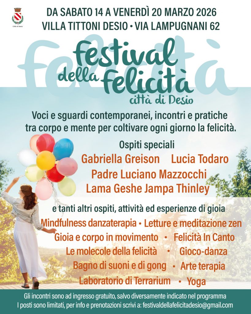 Il Comune di Desio presenta il Festival della Felicità, un’iniziativa dedicata alla promozione del benessere individuale e collettivo, pensata come spazio di riflessione, esperienza e condivisione aperto a tutta la cittadinanza. Un appuntamento che invita a esplorare il tema della felicità in modo contemporaneo e multidisciplinare, intrecciando contributi scientifici e spirituali, incontri teorici e pratiche esperienziali.