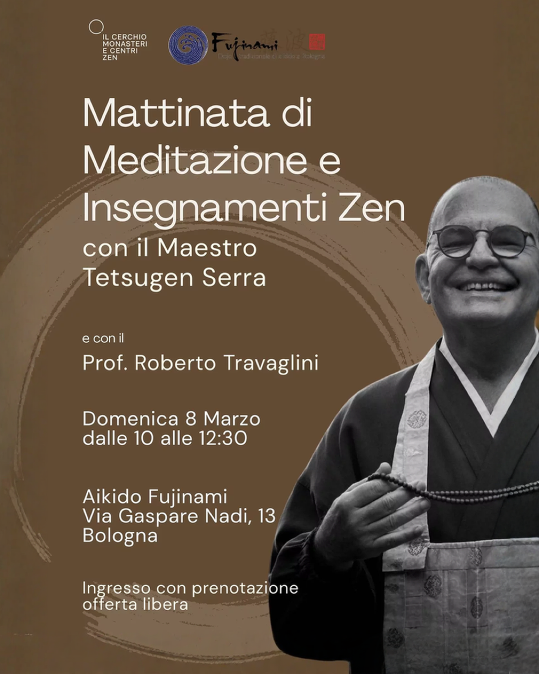 Scopri i nostri eventi Iscriviti Ora Scopri i nostri eventi Vai al calendario eventi Primi Passi nello Zen Inizia a Praticare! Il Cerchio. Monasteri e Centri Zen Scopri i luoghi della Pratica Buddhista Zen in Italia Milano Centro Zen Milano L20 Berceto SanboJi – Tempio dei Tre Gioielli. Cecina GyoSho – Camminando nella Vita Napoli Tempio Zen Ten Shin – Cuore di Cielo Puro Padova Tempio Zen Sokuzen – Orazen Pesaro Tempio Unsui – Nuvole e Acqua Metaverso Zen Metaverse – Il Monastero Virtuale di Ensoji Zen Village: dove essere umani. Scopri il luogo dove la tradizione Zen incontra i bisogni della nostra contemporaneità. Il Maestro Carlo Tetsugen Serra. Dove Meditare in Italia Studiare la Via del Buddha, è studiare sé stessi. Studiare sé stessi è dimenticare sé stessi. Dimenticare sé stessi vuol dire diventare parte del mondo. Eihei Dogen Scopri di più sul nostro lignaggio Pianta il Seme della Consapevolezza. DONA IL TUO 5X1000 Iscriviti e Potrai Meditare in tutte le nostre sedi, Accedere ai corsi e alle meditazioni di Dharma Academy gratuitamente, Sostenere concretamente i Centri e i Monasteri. Dona ora Sostieni l’impegno dei monaci buddhisti zen. Azioni concrete per aiutare tutti gli esseri senzienti. Scopri i progetti attivi! Partecipa ai nostri Eventi Calendario eventi Da venerdì 6 a domenica 8 Marzo 2026 Berceto Corso di Meditazione Zen per Principianti a SanboJi – Marzo 2026 Tre giorni per scoprire le basi della Pratica dello Zen Orario di arrivo venerdì 6 Marzo ore 14:30 | Fine domenica 8 Marzo ore 16:00 Un corso …… Domenica 8 Marzo dalle 10.00 alle 12.30 Dojo Aikido Fujinami – Via Gaspare Nadi 13 – Bologna Mattinata di Meditazione e Insegnamenti Zen a Bologna con il Maestro Tetsugen Serra Domenica 8 Marzo, dalle 10:00 alle 12:30, Il Cerchio arriva per la prima volta a Bologna con una mattinata dedicata alla meditazione e agli insegnamenti …… Calendario eventi Calendario Scopri le ultime news Tutte le news lunedì 2 Marzo Ciclo di presentazioni – Principi zen per la vita quotidiana e la ricerca spirituale con Tetsugen Serra Ciclo di presentazioni con Tetsugen Serra Il Cerchio presenta una serie di incontri pubblici dedicati al libro Principi zen per la vita …… Tutte le news