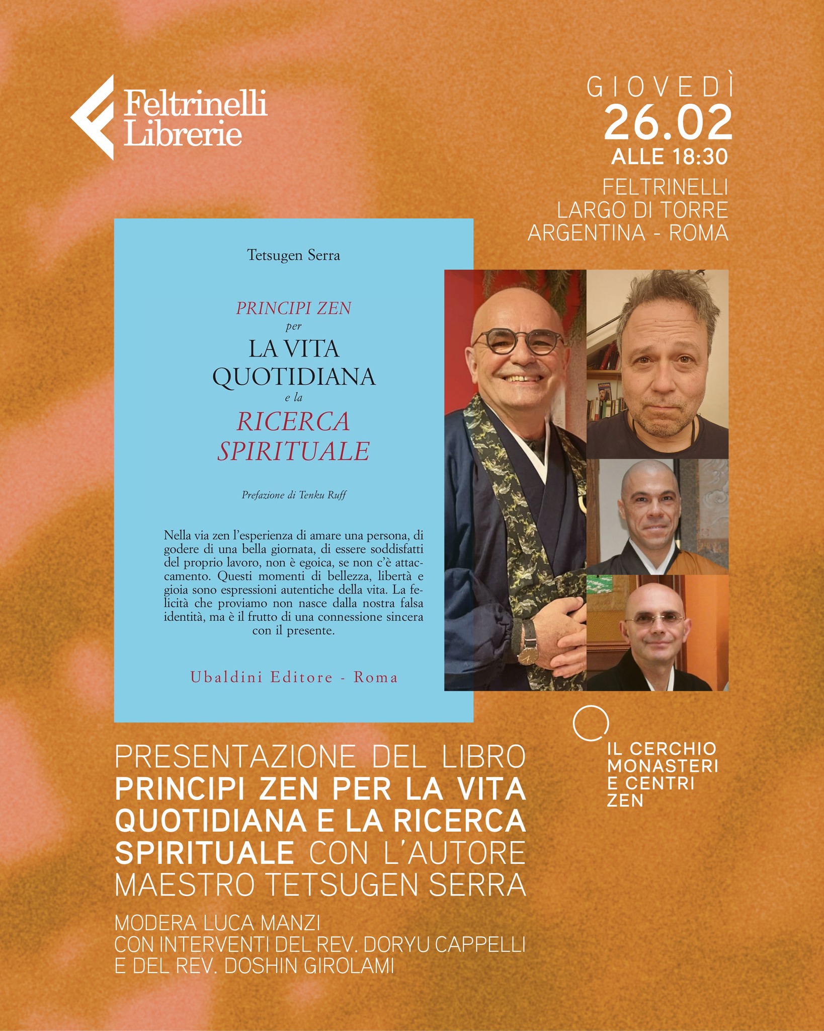 La serata prevede gli interventi del Rev. Tetsugen Serra, del Rev. Doryu Cappelli e del Rev. Doshin Girolami, che offriranno prospettive diverse sulla Via Zen e sulla sua integrazione nella vita quotidiana.